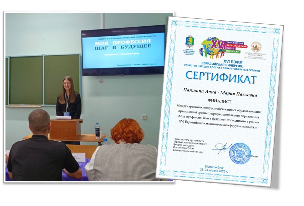 22 апреля 2026 г. в Федеральном государственном бюджетном образовательном учреждении высшего образования «Уральский государственный экономический университет» в рамках Конгресса стратегов Евразийского экономического форума молодежи проводился Международный конкурс обучающихся образовательных организаций среднего профессионального образования «Моя профессия. Шаг в будущее». Целью конкурса является формирование учебной мотивации, познавательного интереса к будущей профессии, популяризация специальностей СПО, обеспечение исследовательской и проектной деятельности Паншина Анна – Мария, обучающаяся группы 212СД24 представила проект по специальности Страховое дело. В своем проекте Анна – Мария отразила историю возникновения специальности, представила современные страховые продукты и тенденции развития страхования, заглянула в будущее специальности.