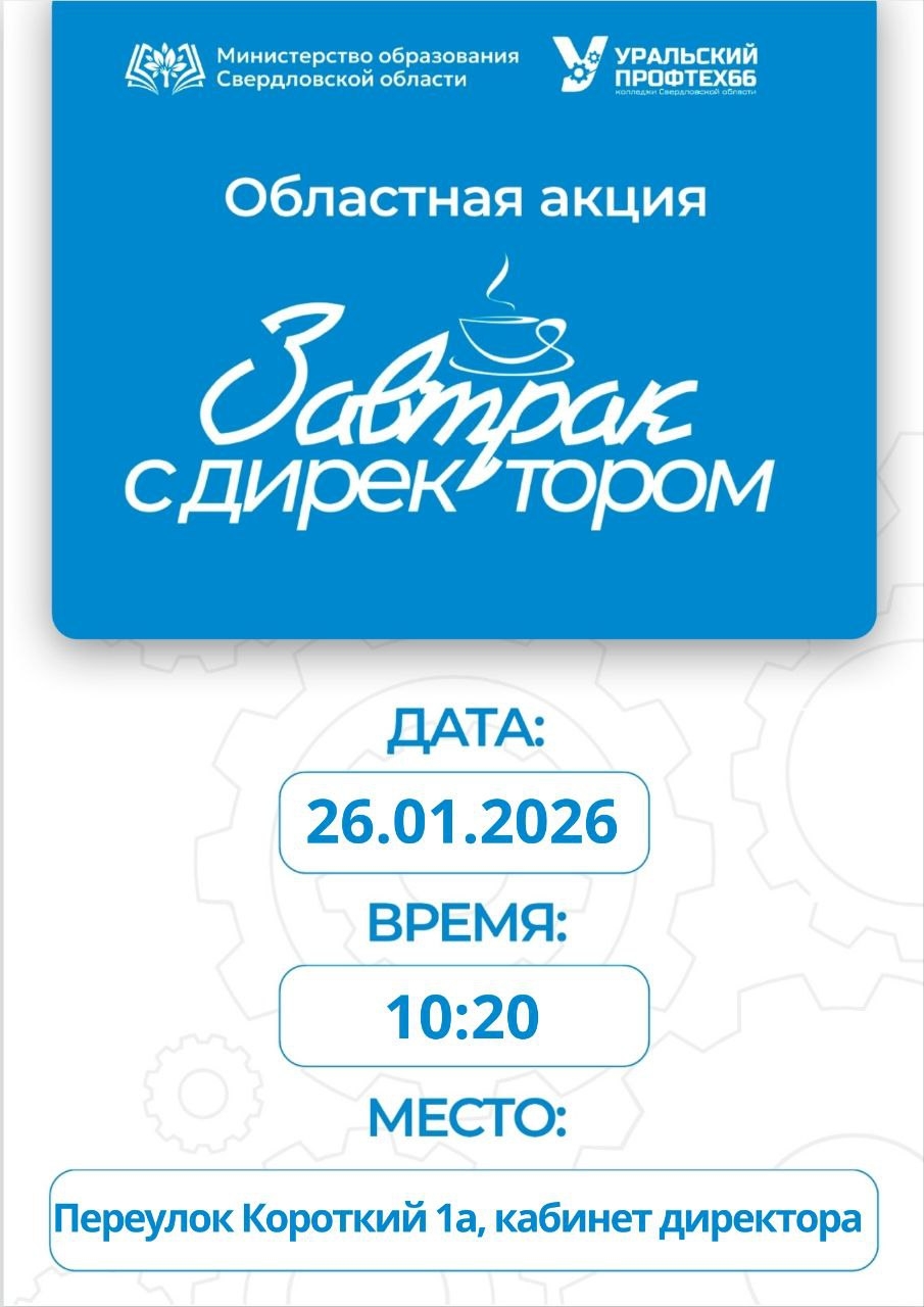 В 2026 году в Свердловской области первый раз проводится акция "Завтрак с директором", приуроченная к Дню Российского студенчества. Завтрак с директором - это отличный формат для сокращения дистанции между руководством и студентами, создания доверительной атмосферы и укрепления связи "Администрация - студент", на встрече будут присутствовать члены Совета обучающихся, волонтерского отряда, Медиацентра. У каждого студента есть возможность попасть на встречу с директором, задав свой интересный вопрос, который вы можете отправить в форме по ссылке https://forms.yandex.ru/u/6971bfcb02848fda93e3df42. 3 автора наиболее интересных вопросов будут приглашены на Завтрак с директором, не забывайте оставлять свои контакты |