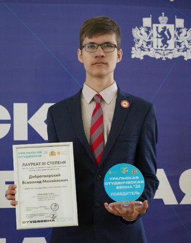 В апреле месяце в г. Екатеринбурге прошел Региональный фестиваль студенческого творчества «Уральская студенческая весна 2026». Мы поздравляем Всеволода с заслуженной победой и желаем ему дальнейших творческих успехов и покорения новых профессиональных высот. Ознакомиться с конкурсными работами вы можете на странице Всеволода vk.ru/dobrotvorsky6 |